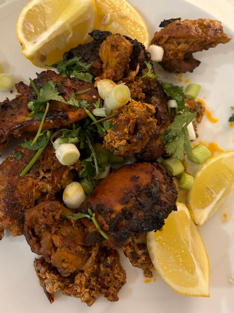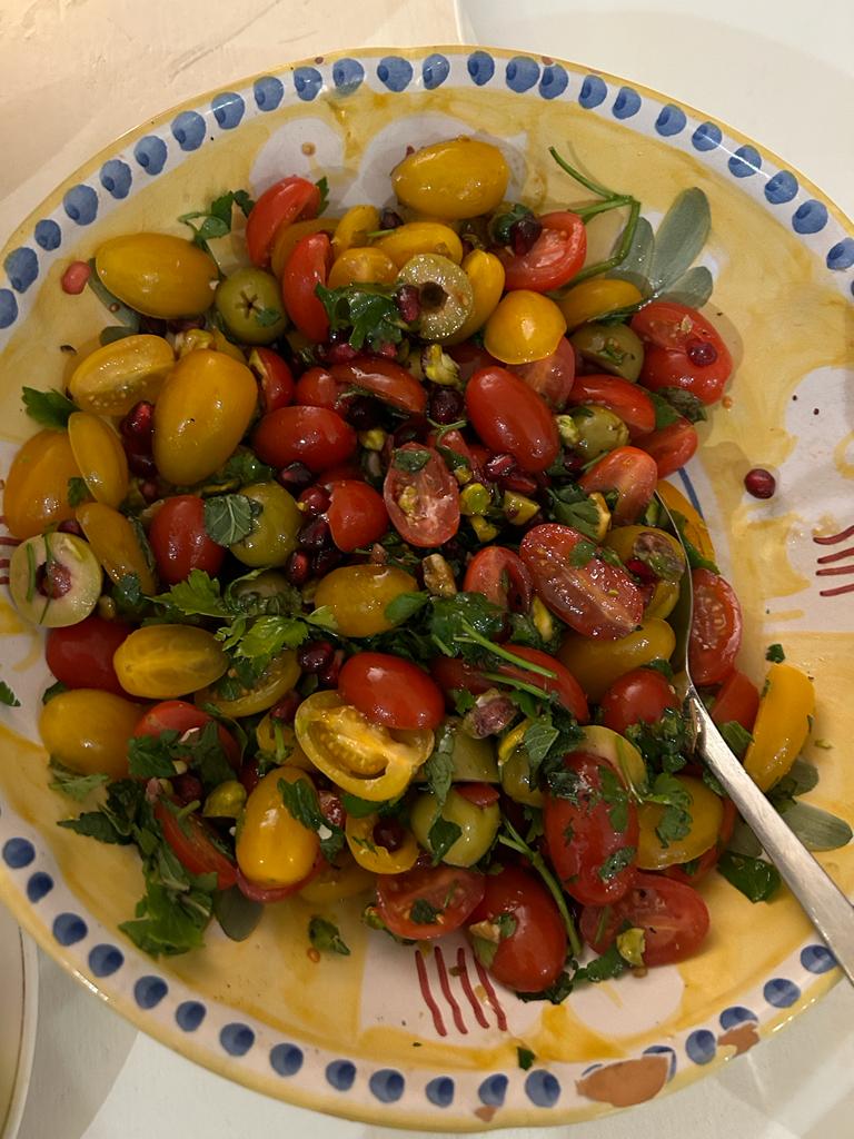 myriad flavours of salty feta, crunchy, and glistening pomegranate seeds, aromatic mint and basil, tossed in a lemon, honey, cumin and cinnamon dressing. Add to this, a jewelled tomato salad – this sounds a simple dish, but one elevated into sumptuousness by the mix of sweet ripe red and yellow baby tomatoes, tangy, salty olives, creamy pistachios, herbs, and the jewel-bright pop of pomegranate seeds. This dish was enhanced further by an intensely rich date molasses dressing.